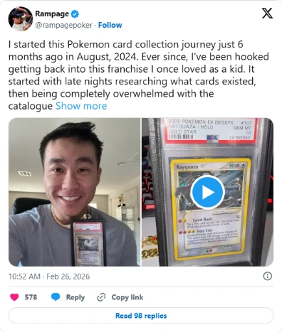 Rampage described the purchase as a journey of personal growth and rediscovery of his inner child, adding the card will stay in his personal collection regardless of future price movement. For context, it still pales in comparison to the $16.49 million Logan Paul received for a Pikachu Illustrator card earlier this month. (Source: Poker News)