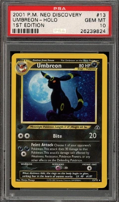 Umbreon #13 sometimes coined as the original Moonbreon, is a Holo Rare from Neo Discovery (2001), one of the most sought-after cards from the Neo era. With only 102 PSA 10s out of 1,728 total graded for the 1st ed. version.