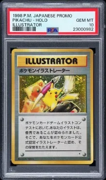 This is the sole PSA GEM MT 10 copy of the 1998 Pikachu Illustrator, a card originally awarded to winners of the CoroCoro Comic "Pokémon Card Game Illustration Artist Contest" with an estimated 41 copies ever distributed.