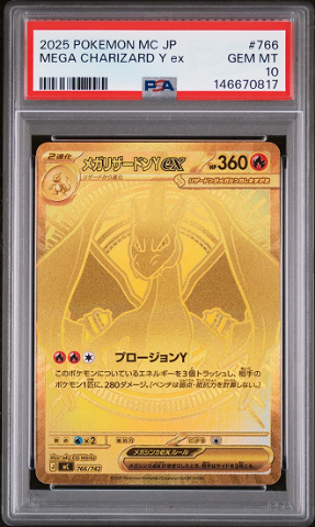 This is the gold Mega Charizard Y ex, a secret variant hidden inside Deck #001 of Japan's Start Deck 100 Battle Collection. Out of 1,000 decks opened, zero were pulled, suggesting odds as low as 1 in 1,000. The English Ascended Heroes equivalent has far higher volume, which is why the Japanese version commands a massive premium.