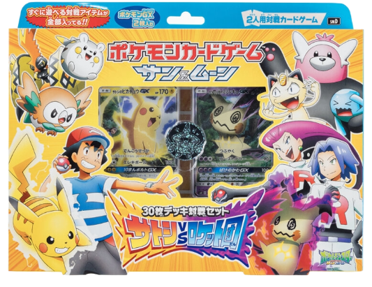 A Japanese-exclusive Sun & Moon era deck kit featuring two 30-card half decks themed around Ash and Team Rocket from the anime. Highlights include Ash's Pikachu GX and Team Rocket's Mimikyu GX with anime-style illustrations.