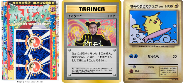 Surfing Pikachu was first available as an unnumbered promotional card on a two-card insert alongside Imakuni? in the September 1997 issue of CoroCoro Comic, released on August 15, 1997. "Unpeeled" refers to the original magazine insert sheet which is incredibly scarce.