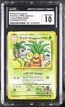 The Bilingual Exeggutor was given to participants of the 1999 Tropical Mega Battle in Hawaii, widely regarded as the first Pokémon World Championships. Only an estimated 36-50 non-glossy copies exist. This is one of just three to earn a CGC 10 grade. It is one of only two cards to feature English text with a Japanese translation (the other being Lucky Stadium).